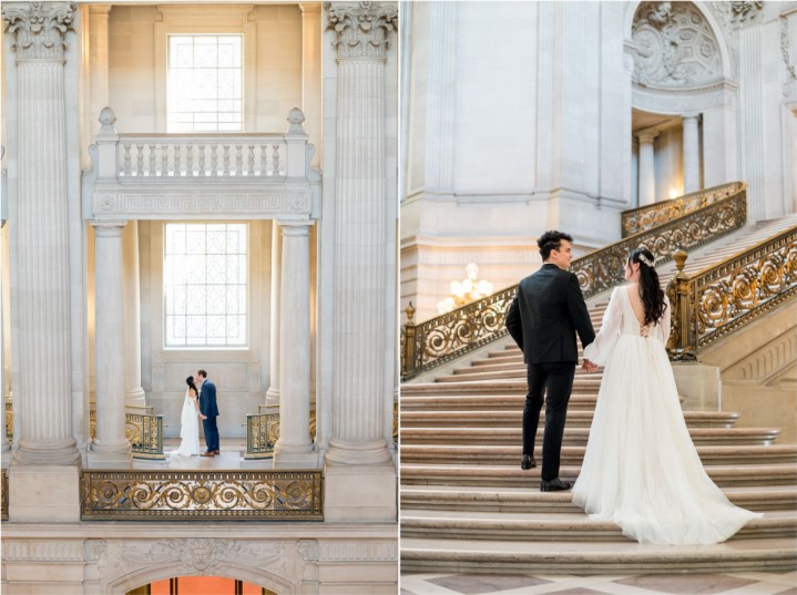 The biggest advantage of choosing City Hall is the light. The dome filters soft, diffused natural light onto the marble interiors, creating flattering highlights and shadows. This creates magazine-style San Francisco City Hall wedding photos that look luxurious without additional lighting equipment.